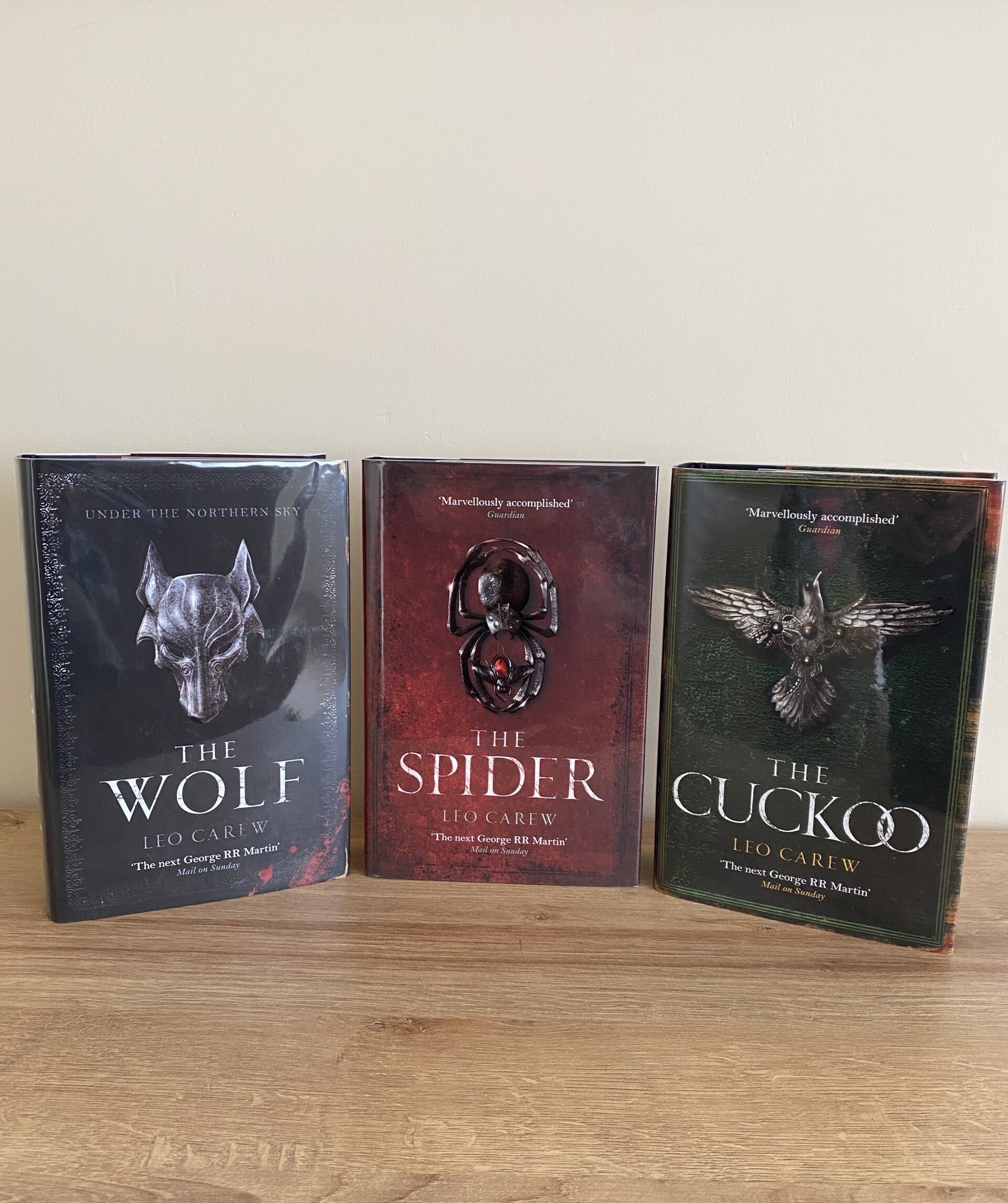 Goldsboro signed, matching numbers, first edition, first print UK hardback set of Leo Carew's acclaimed Goldsboro Under the Northern Sky trilogy, comprising The Wolf, The Spider, and The Cuckoo. New and unread condition.